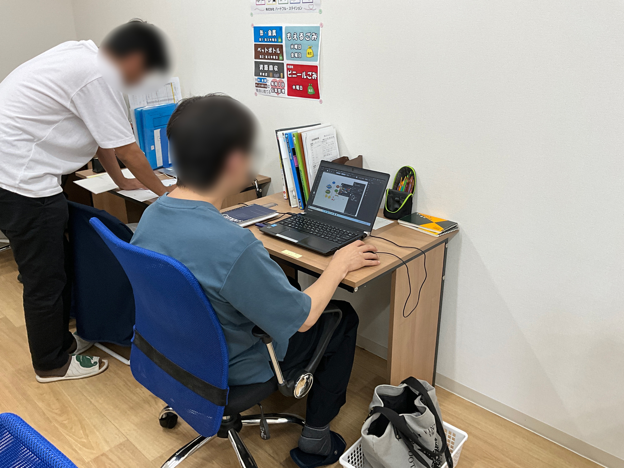 PC班は一人につきひと席の作業スペースで、各作業スペースにPCを設置しています。自分の席ではお好きな飲み物を持参して、お仕事ができます。快適な作業環境も、ハートフル・ステイション一宮の魅力のひとつです。